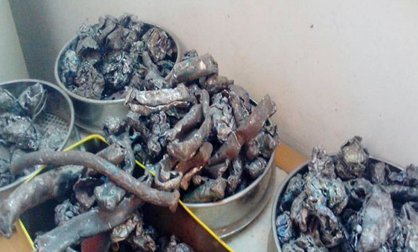 油漆桶破碎机在工作流程上,通过上料输送装置油漆桶被送入设备强制喂料和破碎口,通过压辊和粗碎轴的破碎加工将废旧金属进行初级破碎,经过初级破碎后的油漆桶进入设备主机腔,在高速大扭矩电机的驱动下,主机转子上的锤头轮流击打进入主机腔内的油漆桶,通过衬板与锤头之间的空间,待破碎油漆桶在破碎腔内可得到充分而有效的细碎,从筛网中流下来。破碎物料经过空气回旋分拣系统,把油漆桶的油漆、铁锈、废旧塑料进行分离,在设备底部卸出的物料再通过输送设备运送到集料点,在此过程中物料中含有的非磁性物料在磁选机的作用下被分选卸出生产线落至非磁性物料料堆。另外整个系统装有除尘装置,将生产过程中产生的粉尘污染危害降低。该设备主要有产量高、能耗低、效率高、出料细碎均匀等优点。
