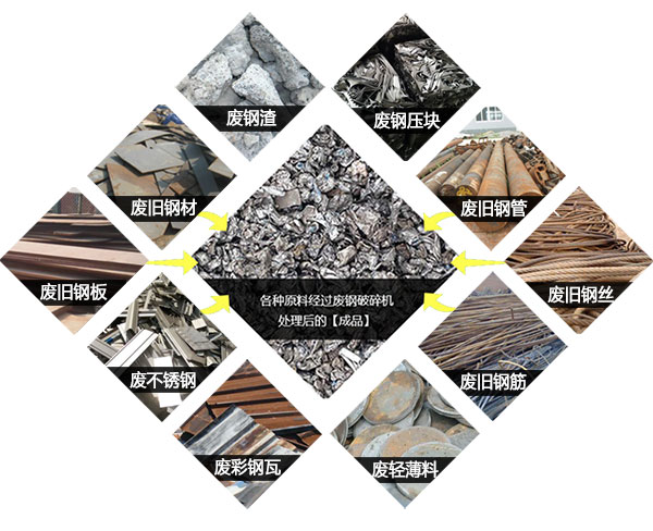 该废钢破碎机适应破碎自行车架,摩托车架,彩钢瓦,车厢板,龙骨条,彩电,冰箱,洗衣机,马口铁,废角钢,废方管,汽车驾驶室,文件柜,保险箱,汽车槽梆,打包压块,电器壳等杂质较多的废钢及工业废器设备。是一种新中型破碎生产线。废钢破碎机适应于年破碎5000T以下的中小用户,中小型炼钢厂,中小型废钢回收公司,使用为钢企提供洁净合格炉料。